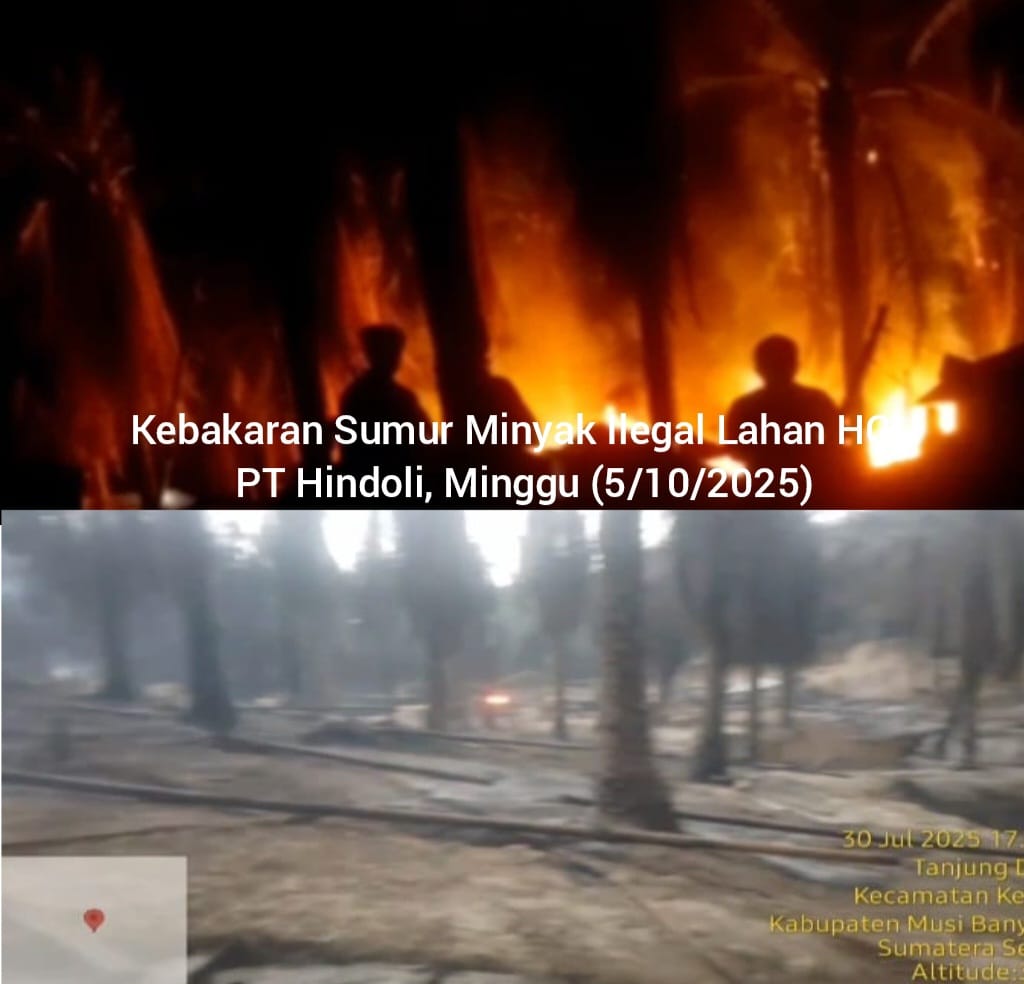 MUBA, INDONESIABERSATU.ID – Kebakaran kembali melanda kawasan pengeboran minyak ilegal di wilayah Hak Guna Usaha (HGU) PT Hindoli Estate Tanjung Dalam, Divisi Kobra 1 Blok I 28, atau yang lebih dikenal dengan sebutan Pintu Air 7, Desa Tanjung Dalam, Kecamatan Keluang, Kabupaten Musi Banyuasin (MUBA), pada Minggu dinihari waktu subuh (5/10/2025).