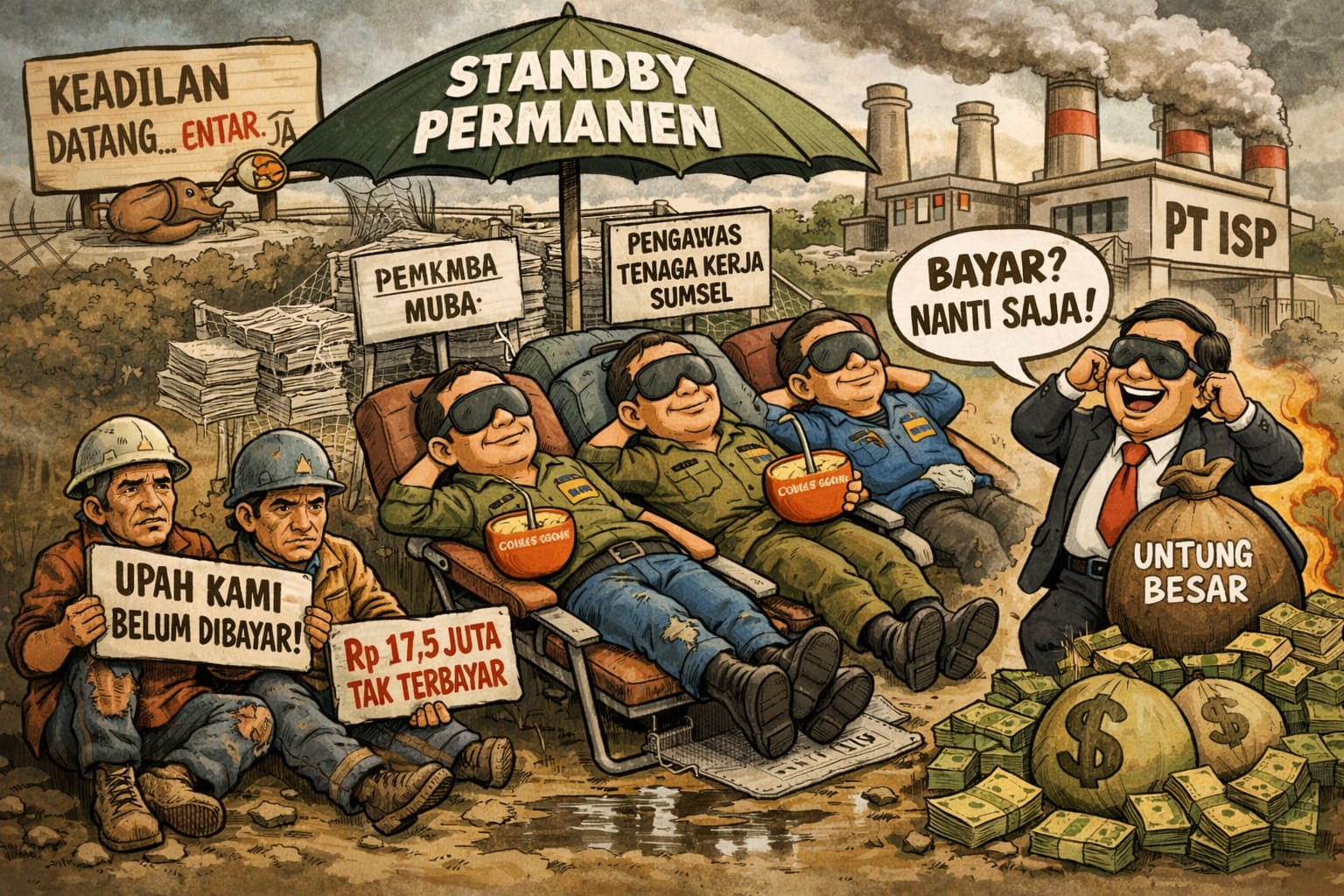 Lebih dari dua tahun berlalu, sejak April 2023, upah pekerja harian PT ISP tak kunjung dibayar. Sementara itu, Pengawas Tenaga Kerja Sumatera Selatan di Sekayu tampaknya telah menemukan mode kerja paling stabil: standby permanen. Hemat energi, minim gerak, namun konsisten.