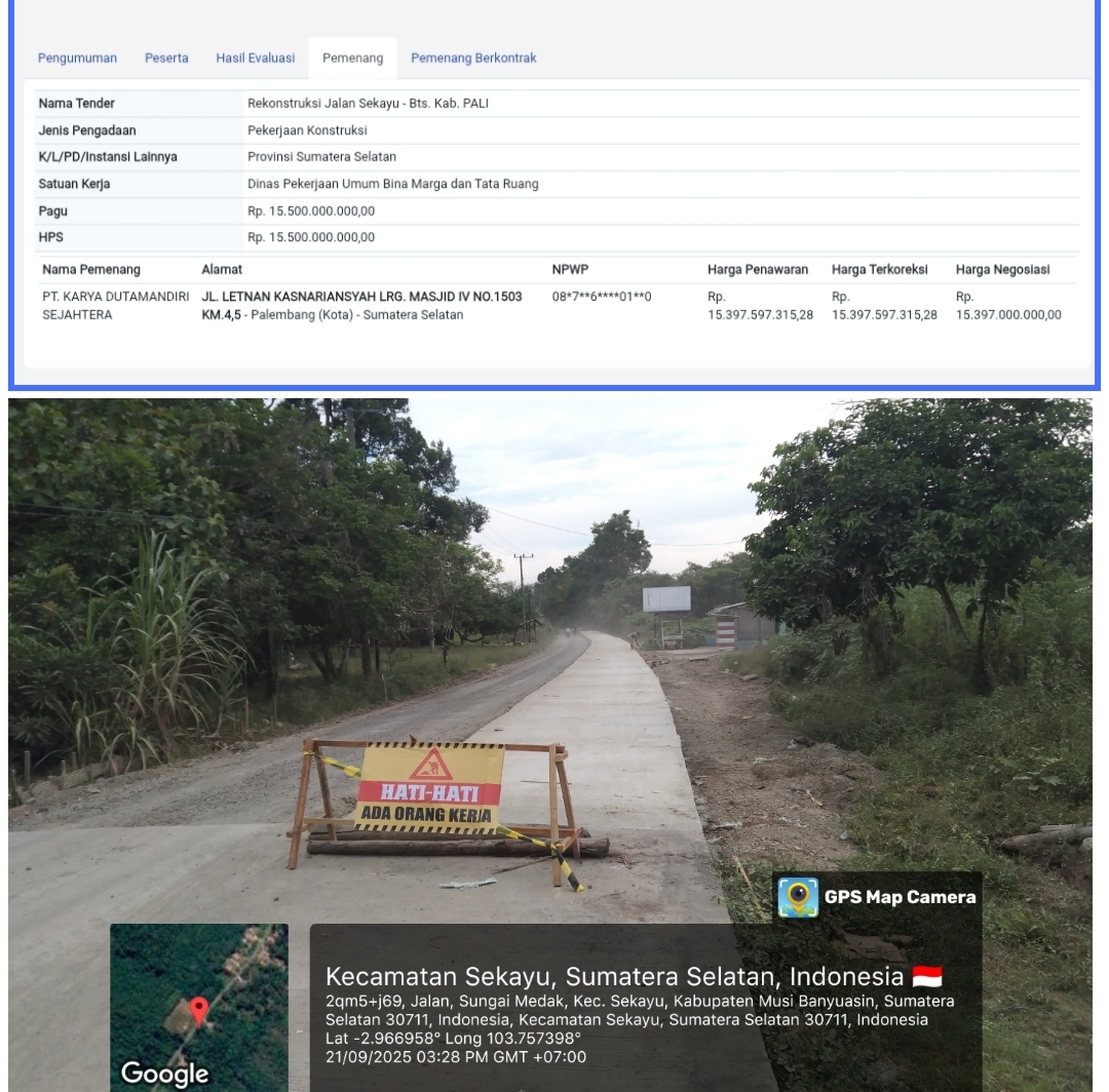 MUBA, INDONESIABERSATU.ID – Proyek rekonstruksi jalan Sekayu – Batas Kabupaten PALI senilai Rp 15,5 Miliar yang dibiayai oleh Dinas Pekerjaan Umum Bina Marga dan Tata Ruang Provinsi Sumatera Selatan (Sumsel) tengah diselimuti kegelapan.