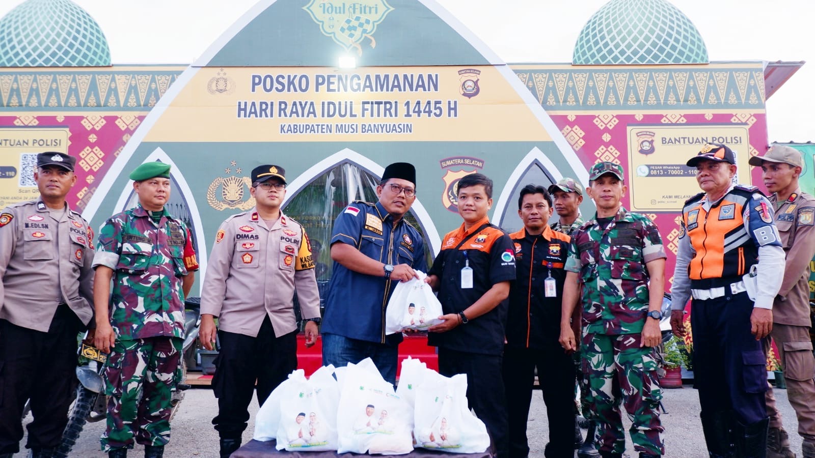 Camat Bayung Lencir, M Imron SSos MSi, Danramil 401-04/Bayung Lencir Lettu Cbh Arsidi, S.H., Kapolsek Bayung Lencir, Iptu Mas Suprayitno STrk, setibanya di pos pengamanan Idul Fitri 2024 yang tepat berada di depan SPBU Mekar Jaya ini langsung menyerahkan bingkisan kepada para petugas penjagaan serta melaksanakan buka bersama.